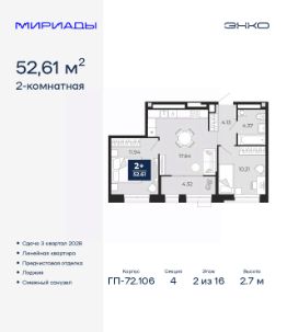 Двухкомнатная квартира от застройщика с предчистовой отделкой в ЖК "Мириады" на 2 этаже. Общая площадь: 52.61 кв.м., жилая: 22.15 кв.м., площадь просторной кухни-столовой: 17.64 кв.м. Комнаты изолированные, все окна выходят на одну сторону. В квартире одна лоджия, один совмещенный санузел. Высота потолков 2.7 м.