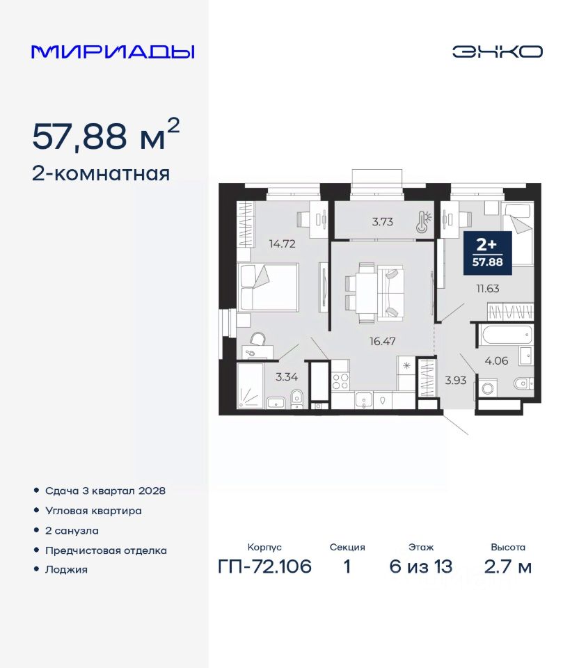 2-комн. квартира с предчистовой отделкой в ЖК "Мириады" на 6 этаже. Общая площадь: 57.88 кв.м., жилая: 26.35 кв.м., площадь просторной кухни-столовой: 16.47 кв.м. Квартира угловая, идеально подойдет любителям тишины и панорамных видов. В квартире одна лоджия, два совмещенных санузла. Высота потолков 2.7 м.