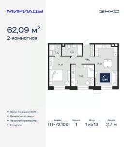 Двухкомнатная квартира с предчистовой отделкой в ЖК "Мириады" на 1 этаже. Общая площадь: 62.09 кв.м., жилая: 25.5 кв.м., площадь просторной кухни-столовой: 21.41 кв.м. Комнаты изолированные, все окна выходят на одну сторону. В квартире два совмещенных санузла. Высота потолков 2.7 м.