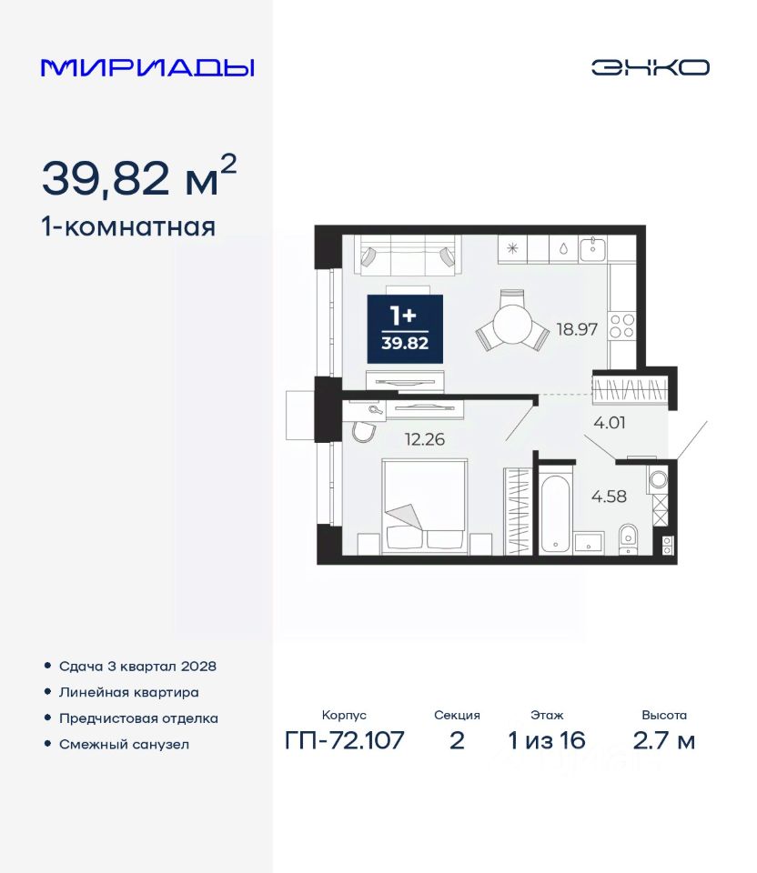 Просторная однокомнатная квартира с предчистовой отделкой в ЖК "Мириады" на 1 этаже. Общая площадь: 39.82 кв.м., жилая: 12.26 кв.м., площадь просторной кухни-столовой: 18.97 кв.м. Все окна выходят на одну сторону. В квартире один совмещенный санузел. Высота потолков 2.7 м.