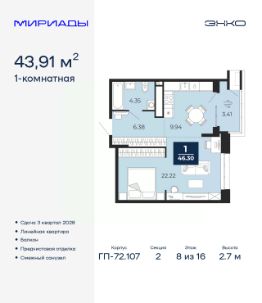 Просторная однокомнатная квартира с предчистовой отделкой в ЖК "Мириады" на 8 этаже. Общая площадь: 43.91 кв.м., жилая: 22.22 кв.м., площадь просторной кухни-столовой: 9.94 кв.м. Все окна выходят на одну сторону. В квартире один балкон, один совмещенный санузел. Высота потолков 2.7 м.