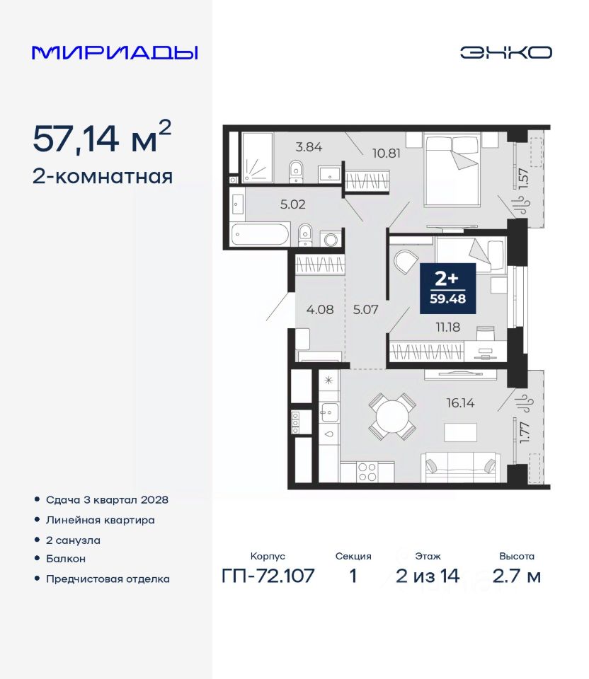 Просторная 2-комн. квартира с предчистовой отделкой в ЖК "Мириады" на 2 этаже. Общая площадь: 57.14 кв.м., жилая: 21.99 кв.м., площадь просторной кухни-столовой: 16.14 кв.м. Комнаты изолированные, все окна выходят на одну сторону. В квартире два балкона, два совмещенных санузла. Высота потолков 2.7 м.