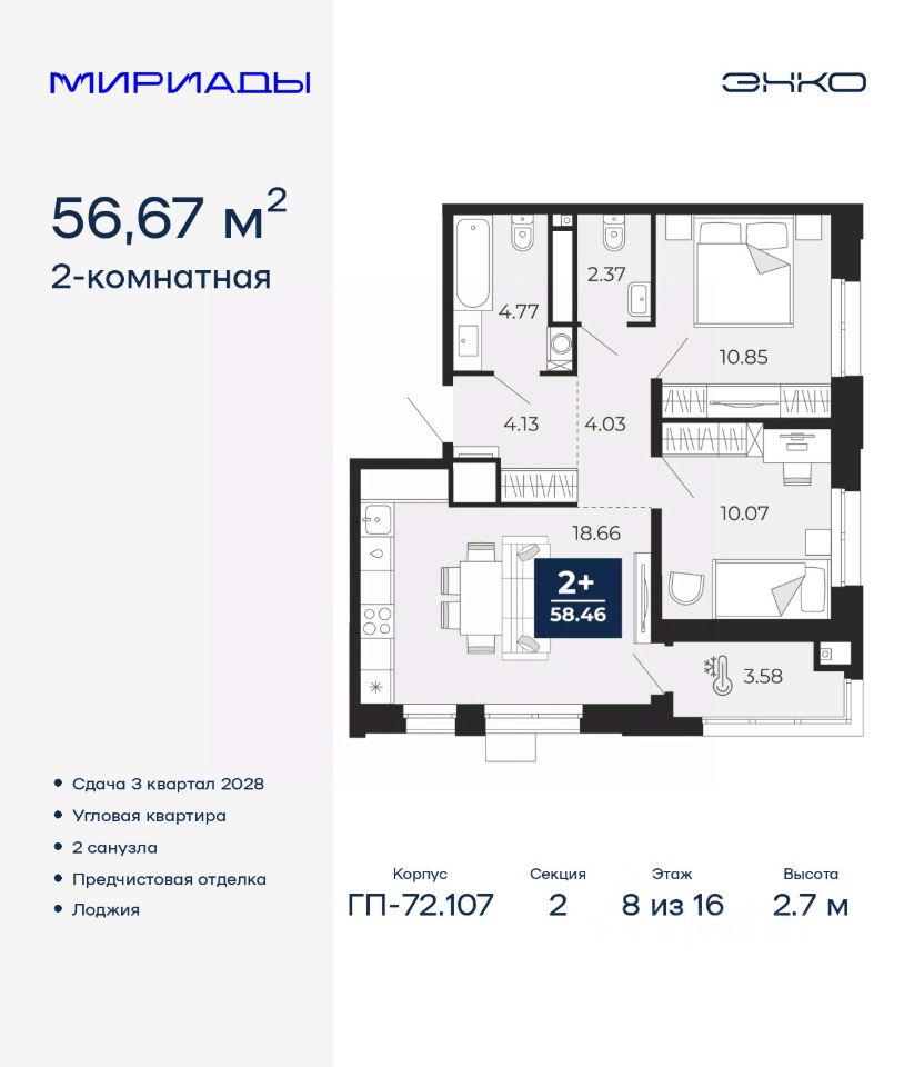 Двухкомнатная квартира с предчистовой отделкой в ЖК "Мириады" на 8 этаже. Общая площадь: 56.67 кв.м., жилая: 20.92 кв.м., площадь просторной кухни-столовой: 18.66 кв.м. Угловая квартира, идеально подойдет любителям тишины и панорамных видов. В квартире одна лоджия, один совмещенный и один раздельный санузел. Высота потолков 2.7 м.