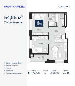 2-комн. квартира с предчистовой отделкой в ЖК "Мириады" на 8 этаже. Общая площадь: 54.55 кв.м., жилая: 23.92 кв.м., площадь просторной кухни-столовой: 15.77 кв.м. Квартира угловая, идеально подойдет любителям тишины и панорамных видов. В квартире одна лоджия, два совмещенных санузла. Высота потолков 2.7 м.