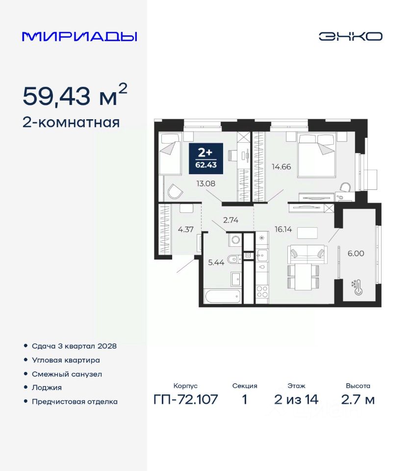 Просторная 2-комн. квартира с предчистовой отделкой в ЖК "Мириады" на 2 этаже. Общая площадь: 59.43 кв.м., жилая: 27.74 кв.м., площадь просторной кухни-столовой: 16.14 кв.м. Угловая квартира, очень светлая, естественная вентиляция при открытии окон. В квартире одна лоджия, один совмещенный санузел. Высота потолков 2.7 м.