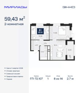 Двухкомнатная квартира с предчистовой отделкой в ЖК "Мириады" на 8 этаже. Общая площадь: 59.43 кв.м., жилая: 27.74 кв.м., площадь просторной кухни-столовой: 16.14 кв.м. Квартира угловая, идеально подойдет любителям тишины и панорамных видов. В квартире одна лоджия, один совмещенный санузел. Высота потолков 2.7 м.