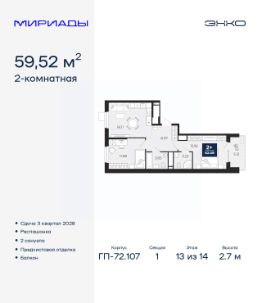 Спешите забронировать по акционной цене! Предложение ограничено! Стоимость квартиры указана со скидкой, ваша экономия составит 404,000 RUB. Информация по телефону, наши менеджеры вам все расскажут! Просторная двухкомнатная квартира с предчистовой отделкой в ЖК "Мириады" на 13 этаже. Общая площадь: 59.52 кв.м., жилая: 25.72 кв.м., площадь просторной кухни-столовой: 16.11 кв.м. Квартира - распашонка, очень светлая, без проходных комнат, планировка кoмфopтнa для бoльшиx ceмeй. В квартире один балкон, два совмещенных санузла. Высота потолков 2.7 м. Дом монолитный, двухподъездный, переменной этажности, от 14 до 16 этажей. Квартира находится в 1-й секции высотой 14 этажей в корпусе ГП-72.107. На этаже 5 квартир. В подъезде 1 пассажирский и 1 грузовой лифт. Окончание строительства - 3 квартал 2028 года. Оформление сделки по договору долевого участия. Вселенная бесконечных историй. Ранее невиданный Тюмени масштаб: территория 240 гектаров и 1 650 000 м² застройки. Мириады это город масштабных перемен и больших возможностей. Город зеленых рощ и зеркальных озер. Город для работы, учебы и развлечений. Город для детей и их родителей. Город для всех и каждого. Проект расположен в районе Мыс рядом с ТРЦ "Тюмень Сити Молл" в границах улицы Тимофея Чаркова, Тобольского тракта и объездной дороги. Срок полного освоения территории - до 2034 года. #zMDAUC