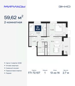 Продается 2-комн. квартира от застройщика с предчистовой отделкой в ЖК "Мириады" на 13 этаже. Общая площадь: 59.62 кв.м., жилая: 27.74 кв.м., площадь просторной кухни-столовой: 16.14 кв.м. Квартира угловая, идеально подойдет любителям тишины и панорамных видов. В квартире одна лоджия, один совмещенный санузел. Высота потолков 2.7 м.