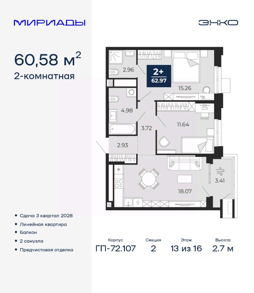 Продается 2-комн. квартира с предчистовой отделкой в ЖК "Мириады" на 13 этаже. Общая площадь: 60.58 кв.м., жилая: 26.9 кв.м., площадь просторной кухни-столовой: 18.07 кв.м. Комнаты изолированные, все окна выходят на одну сторону. В квартире один балкон, два совмещенных санузла. Высота потолков 2.7 м.