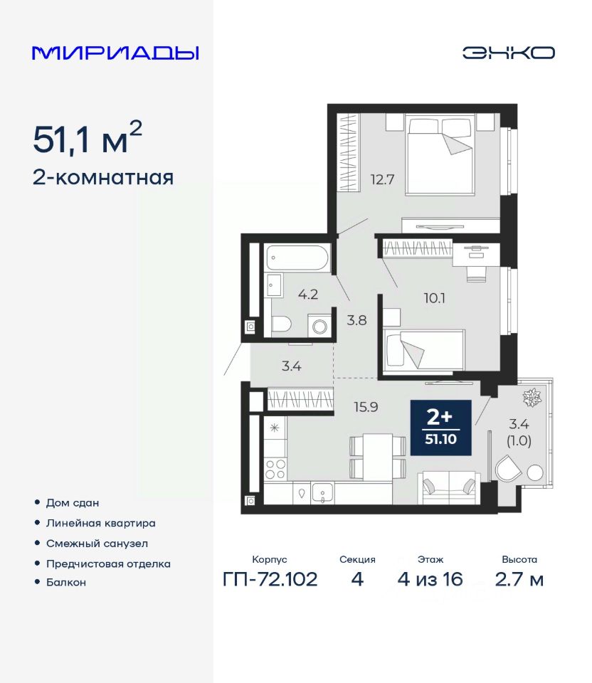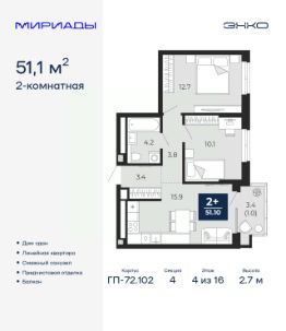 Двухкомнатная квартира от застройщика с предчистовой отделкой в ЖК "Мириады" на 4 этаже. Общая площадь: 51.1 кв.м., жилая: 22.8 кв.м., площадь просторной кухни-столовой: 15.9 кв.м. Комнаты изолированные, все окна выходят на одну сторону. В квартире один балкон, один совмещенный санузел. Высота потолков 2.7 м.