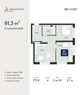Двухкомнатная квартира с предчистовой отделкой в ЖК "Айвазовский City" на 2 этаже. Общая площадь: 61.3 кв.м., жилая: 26.3 кв.м., площадь просторной кухни-столовой: 18.6 кв.м. Угловая квартира, очень светлая, естественная вентиляция при открытии окон. В квартире один совмещенный санузел. Высота потолков 2.7 м.