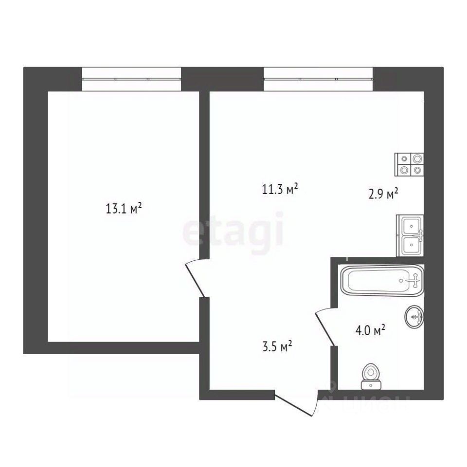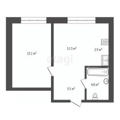 Удобная планировка. Общая площадь - 34,8 кв.м. Кухня-гостиная составляет 14,2 кв.м., комната - 13,1.