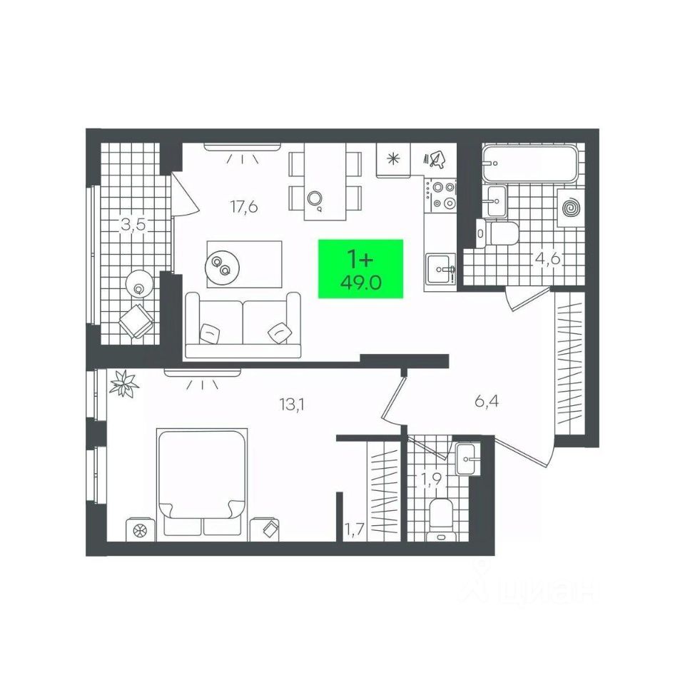 Продается 1-комн. квартира, 49,01 м²