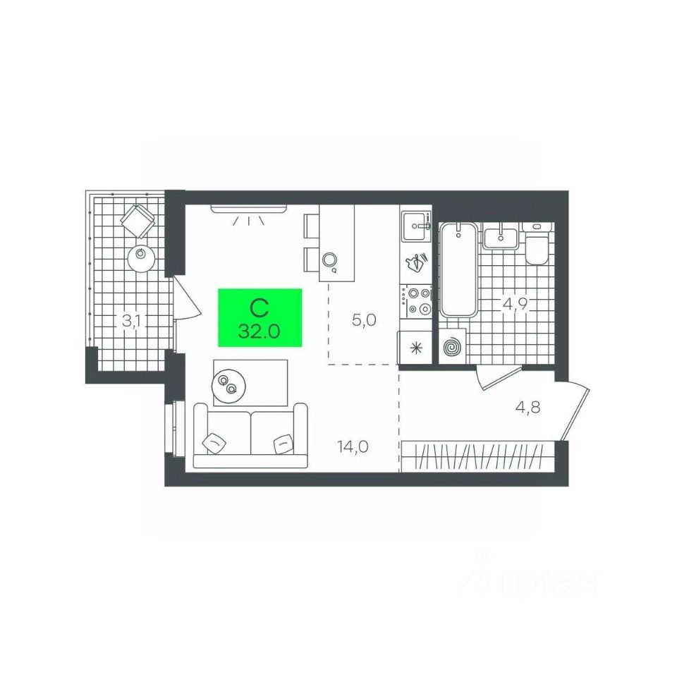 Общая площадь32,08 м²