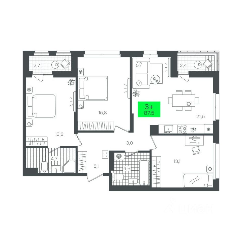 Общая площадь87,5 м²