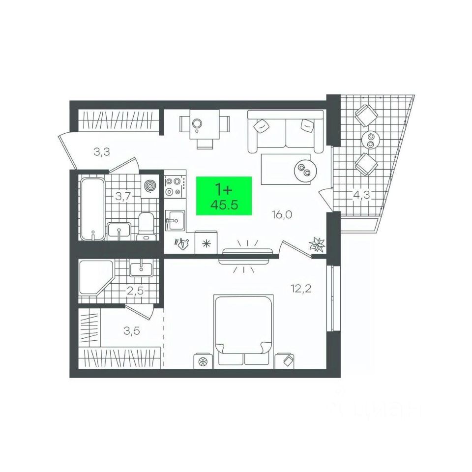 Общая площадь45,5 м²