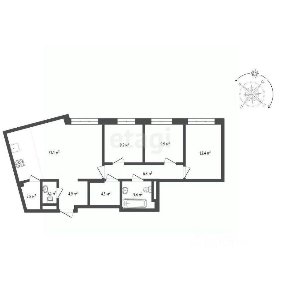 Планировка: кухня-гостиная 31,1 м², 3 комнаты, 2 санузла
