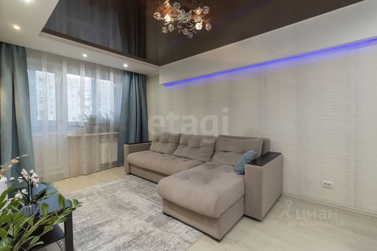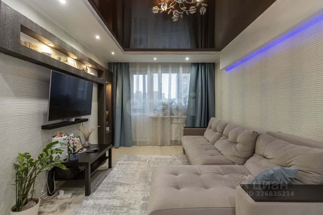 Просторная гостиная с мягким угловым диваном, зоной ТВ и встроенной системой хранения. Современное освещение, натяжной потолок, спокойная цветовая гамма создают комфортную атмосферу для отдыха.