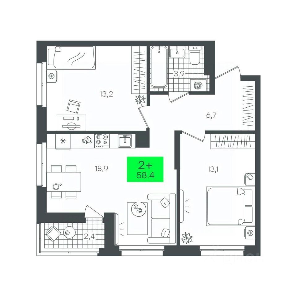 Общая площадь58,49 м²