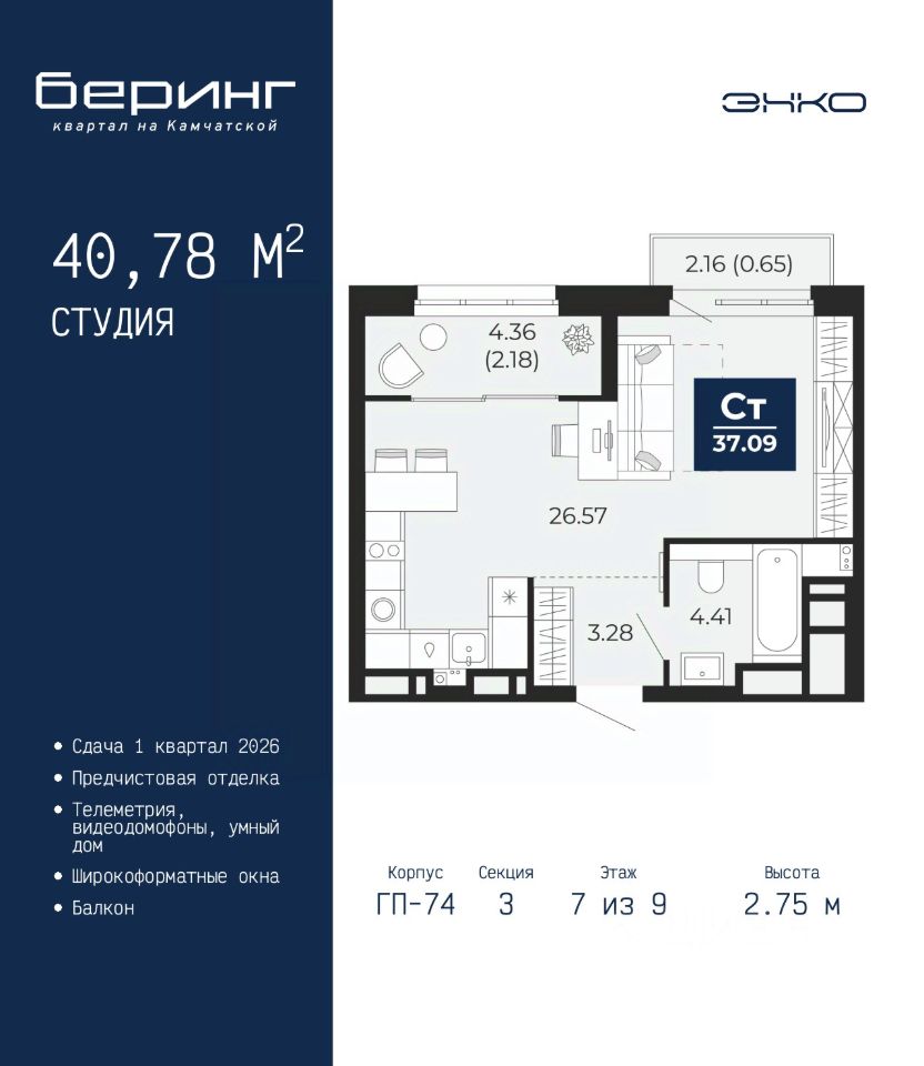 Однокомнатная квартира-студия от застройщика с предчистовой отделкой в ЖК "Беринг" на 7 этаже. Общая площадь: 40.78 кв.м., площадь гостиной 26.57 кв.м., из которых 10 кв.м. выделено под кухонную зону. Все окна выходят на одну сторону. В квартире один балкон, один совмещенный санузел. Высота потолков 2.75 м.