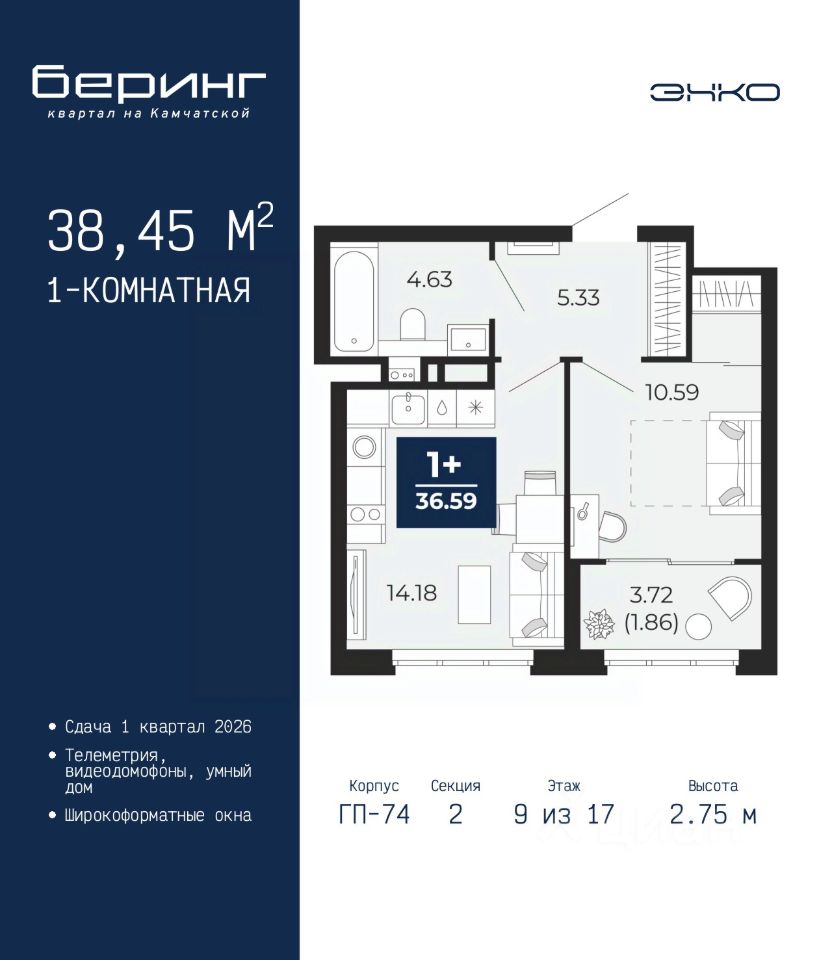 Успейте оформить бронирование, пока действует скидка, срок предложения ограничен! Стоимость квартиры указана со скидкой, ваша экономия составит 300,485 руб. По всем вопросам звоните в офис продаж, наши менеджеры вам все расскажут. Однокомнатная квартира от застройщика с предчистовой отделкой в ЖК "Беринг" на 9 этаже. Общая площадь: 38.45 кв.м., жилая: 10.59 кв.м., площадь просторной кухни-столовой: 14.18 кв.м. Все окна выходят на одну сторону. В квартире одна лоджия, один совмещенный санузел. Высота потолков 2.75 м. Дом монолитный, многоподъездный, переменной этажности, от 9 до 21 этажей. Квартира находится во 2-й секции высотой 17 этажей в корпусе ГП-74. На этаже 7 квартир. В подъезде 1 пассажирский и 1 грузовой лифт. Окончание строительства - 1 квартал 2026 года. Оформление сделки по договору долевого участия. Подобно знаменитому исследователю, мы чувствуем себя первооткрывателями этой локации. Хотим показать новую суть места, сформировать для вас жизненный опыт, которого ещё не было. Беринг — район зелёного цвета. Беринг — район, который откроется вам с другой стороны. Впечатлит новым уровнем комфорта и качеством жизни. Беринг — открытие на карте города. Первый квартал расположен в районе Тура, в границах улиц: Камчатская Западносибирская Энтузиастов. Вокруг уже есть всё для того, чтобы ежедневная рутина была лишь частью жизни и не доставляла дискомфорта. Школы и детские сады, магазины и аптеки, поликлиника, места для семейного отдыха, пеших и велопрогулок, и даже рыбалки. Масштабное озеленение дворов — визитная карточка ЭНКО и ваш оазис спокойствия, чтобы отвлечься от повседневности. Раскидистые деревья, кустарники, травы и цветы — осталось остановиться, вдохнуть и расслабиться, глядя на эту природную красоту. Стилистика подъездов продолжает концепцию Беринга, вдохновлённого Камчаткой: сдержанный, но при этом впечатляющий дизайн соседствует с удобством и функциональностью. #ZMddD6