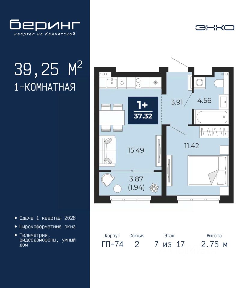 Продается однокомнатная квартира в ЖК "Беринг" на 7 этаже. Общая площадь: 39.25 кв.м. Высота потолков 2.75 м.