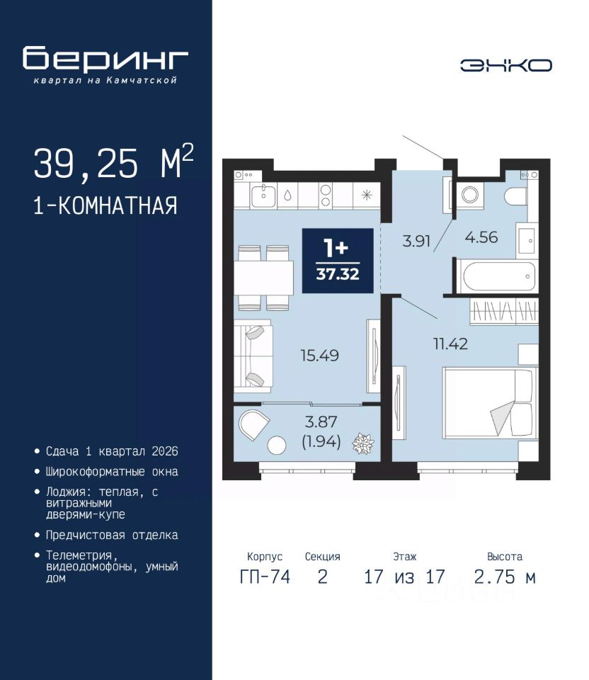 1-комн. квартира от застройщика с предчистовой отделкой в ЖК "Беринг" на 17 этаже. Общая площадь: 39.25 кв.м., жилая: 11.42 кв.м., площадь просторной кухни-столовой: 15.49 кв.м. Все окна выходят на одну сторону. В квартире одна лоджия, один совмещенный санузел. Высота потолков 2.75 м.