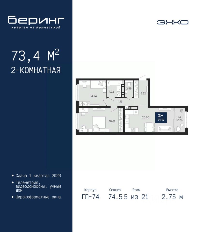 Продается 2-комн. квартира от застройщика в ЖК "Беринг" на 5 этаже. Общая площадь: 73.4 кв.м. Высота потолков 2.75 м.