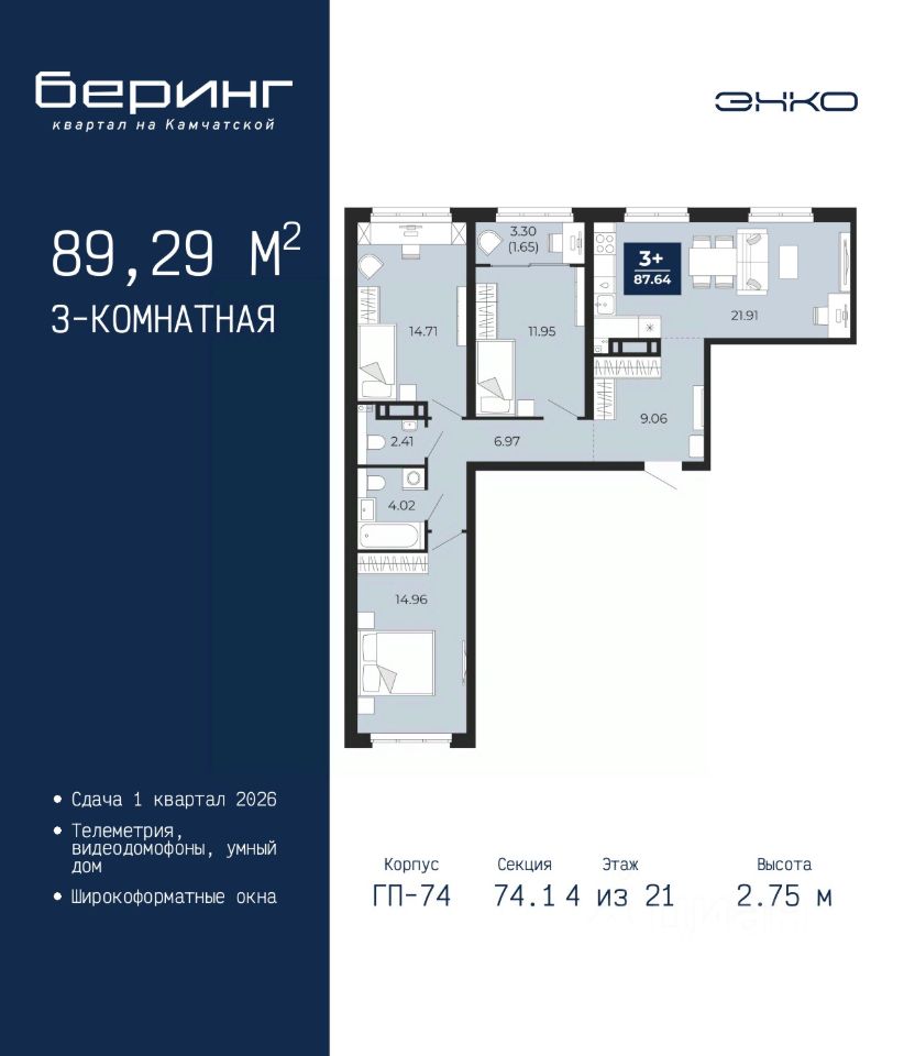 Просторная 3-комн. квартира в ЖК "Беринг" на 4 этаже. Общая площадь: 89.29 кв.м. Высота потолков 2.75 м.