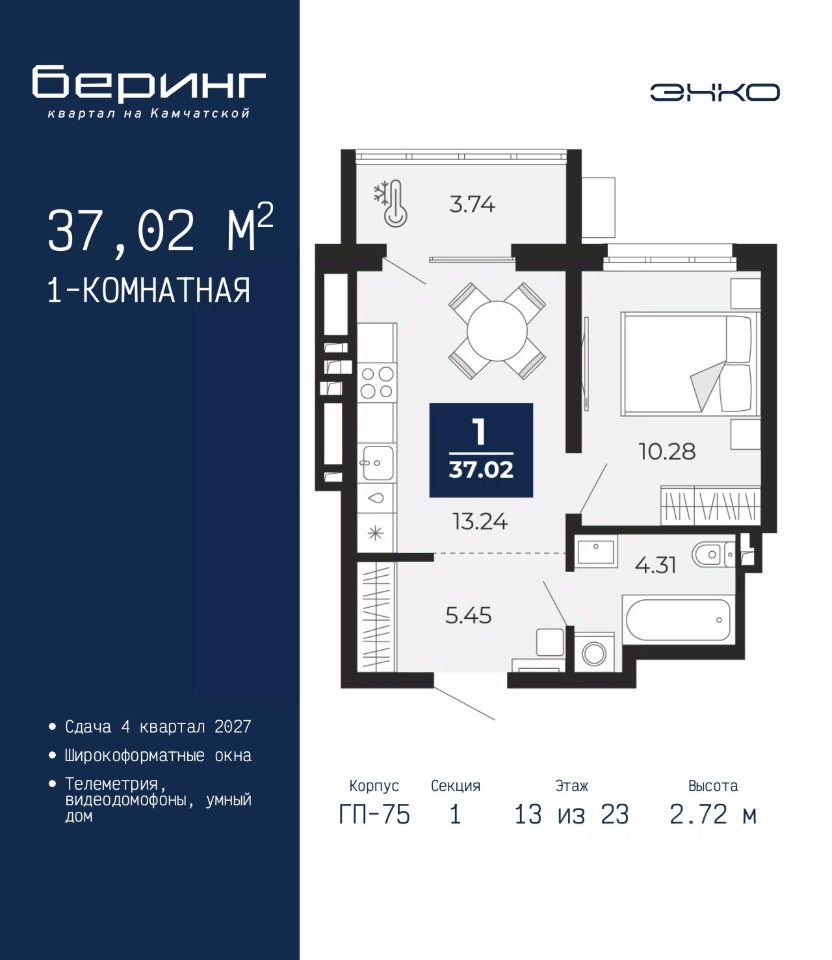 Продается 1-комн. квартира в ЖК "Беринг" на 13 этаже. Общая площадь: 37.02 кв.м. Высота потолков 2.72 м.