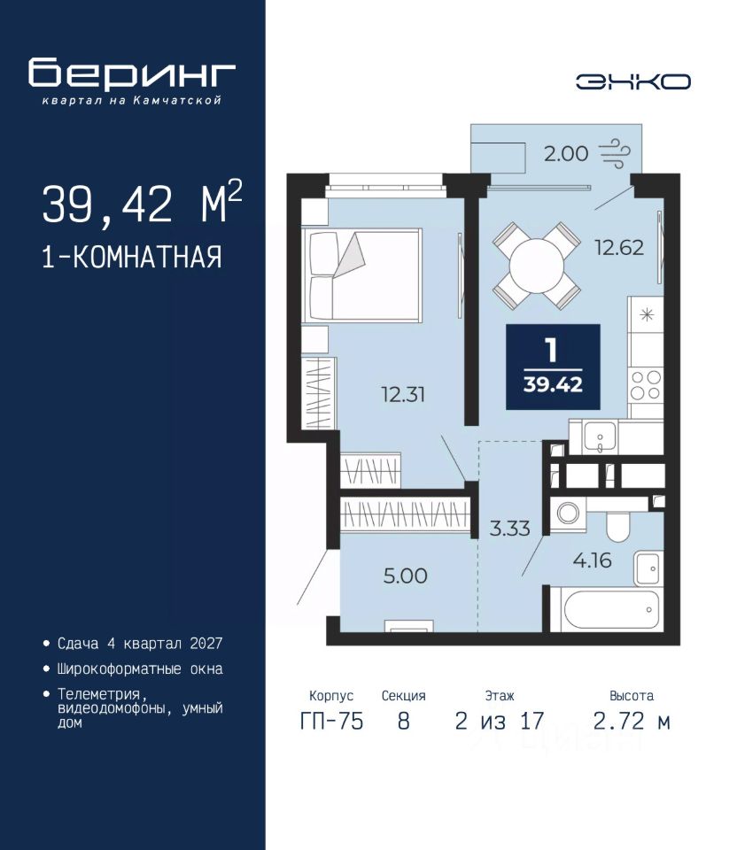 Однокомнатная квартира с предчистовой отделкой в ЖК "Беринг" на 2 этаже. Общая площадь: 39.42 кв.м., жилая: 12.31 кв.м., площадь просторной кухни-столовой: 12.62 кв.м. Все окна выходят на одну сторону. В квартире один балкон, один совмещенный санузел. Высота потолков 2.72 м.