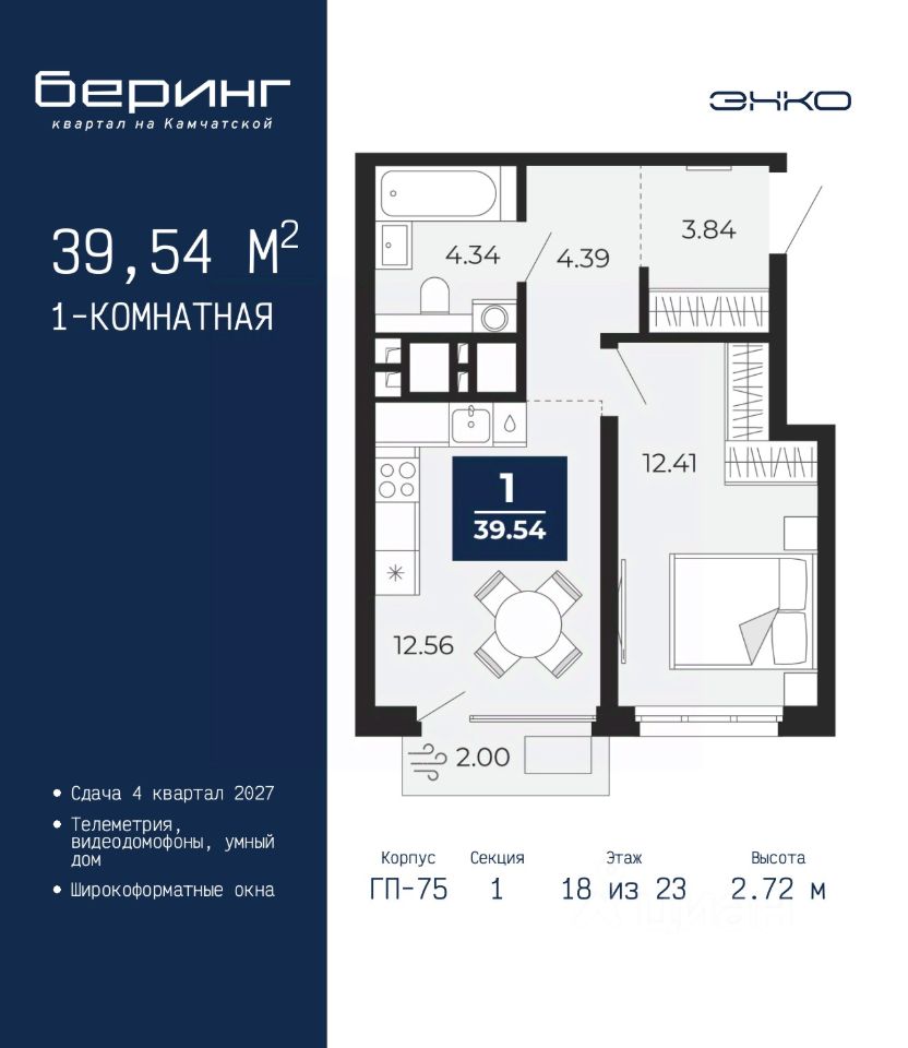 Продается 1-комн. квартира в ЖК "Беринг" на 18 этаже. Общая площадь: 39.54 кв.м. Высота потолков 2.72 м.