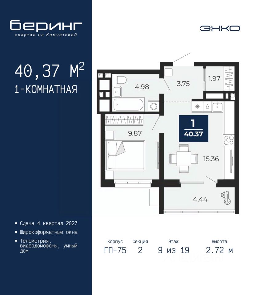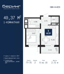 Продается 1-комн. квартира в ЖК "Беринг" на 9 этаже. Общая площадь: 40.37 кв.м. Высота потолков 2.72 м.