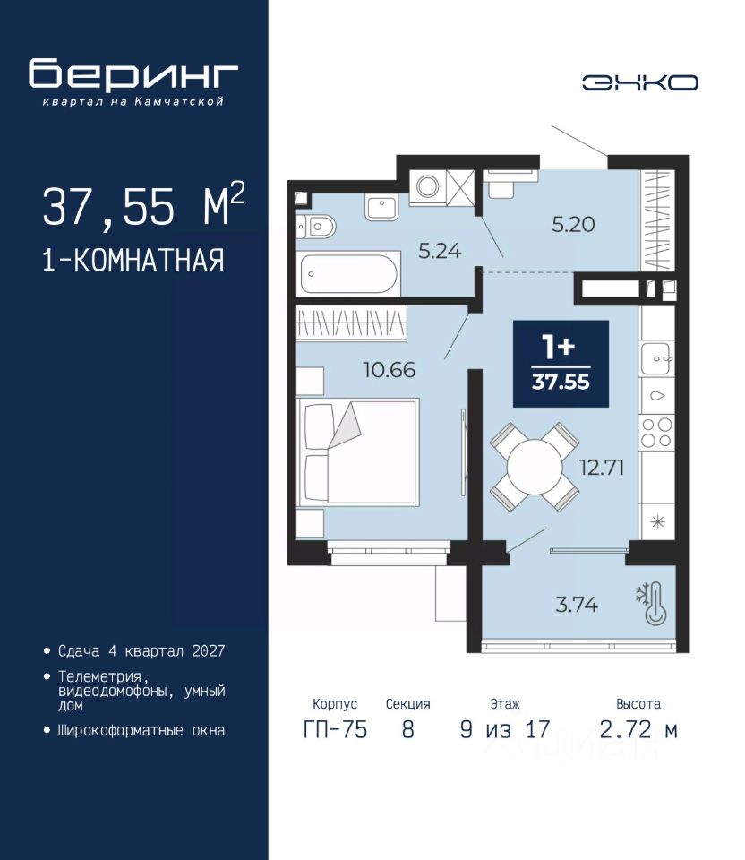 Продается 1-комн. квартира с предчистовой отделкой в ЖК "Беринг" на 9 этаже. Общая площадь: 37.55 кв.м., жилая: 10.66 кв.м., площадь просторной кухни-столовой: 12.71 кв.м. Все окна выходят на одну сторону. В квартире один балкон, один совмещенный санузел. Высота потолков 2.72 м.