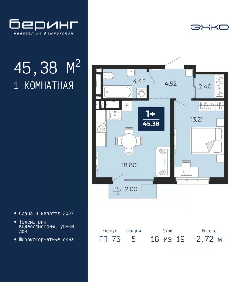 Просторная однокомнатная квартира в ЖК "Беринг" на 18 этаже. Общая площадь: 45.38 кв.м. Высота потолков 2.72 м.