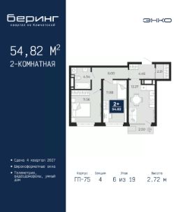 Продается двухкомнатная квартира в ЖК "Беринг" на 6 этаже. Общая площадь: 54.82 кв.м. Высота потолков 2.72 м.