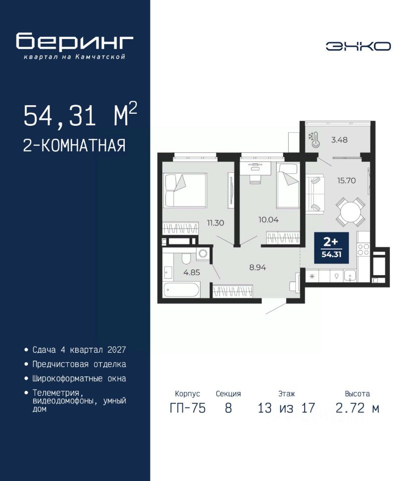 2-комн. квартира с предчистовой отделкой в ЖК "Беринг" на 13 этаже. Общая площадь: 54.31 кв.м. Высота потолков 2.72 м.