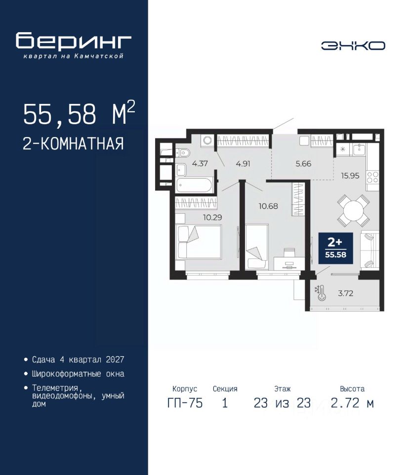 Двухкомнатная квартира от застройщика в ЖК "Беринг" на 23 этаже. Общая площадь: 55.58 кв.м. Высота потолков 2.72 м.