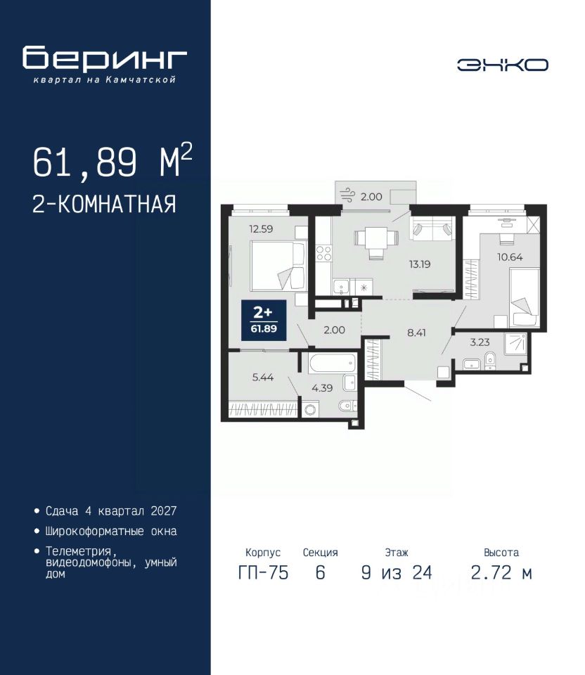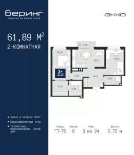 Продается 2-комн. квартира от застройщика в ЖК "Беринг" на 9 этаже. Общая площадь: 61.89 кв.м. Высота потолков 2.72 м.