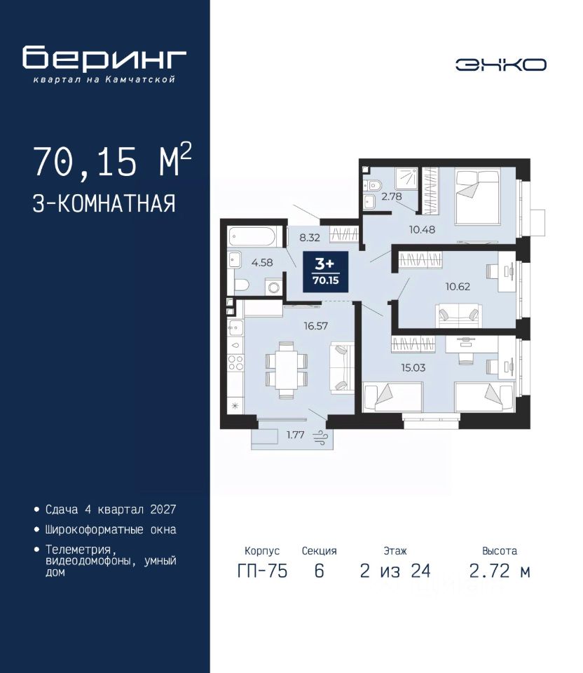 Просторная трехкомнатная квартира в ЖК "Беринг" на 2 этаже. Общая площадь: 70.15 кв.м. Высота потолков 2.72 м.
