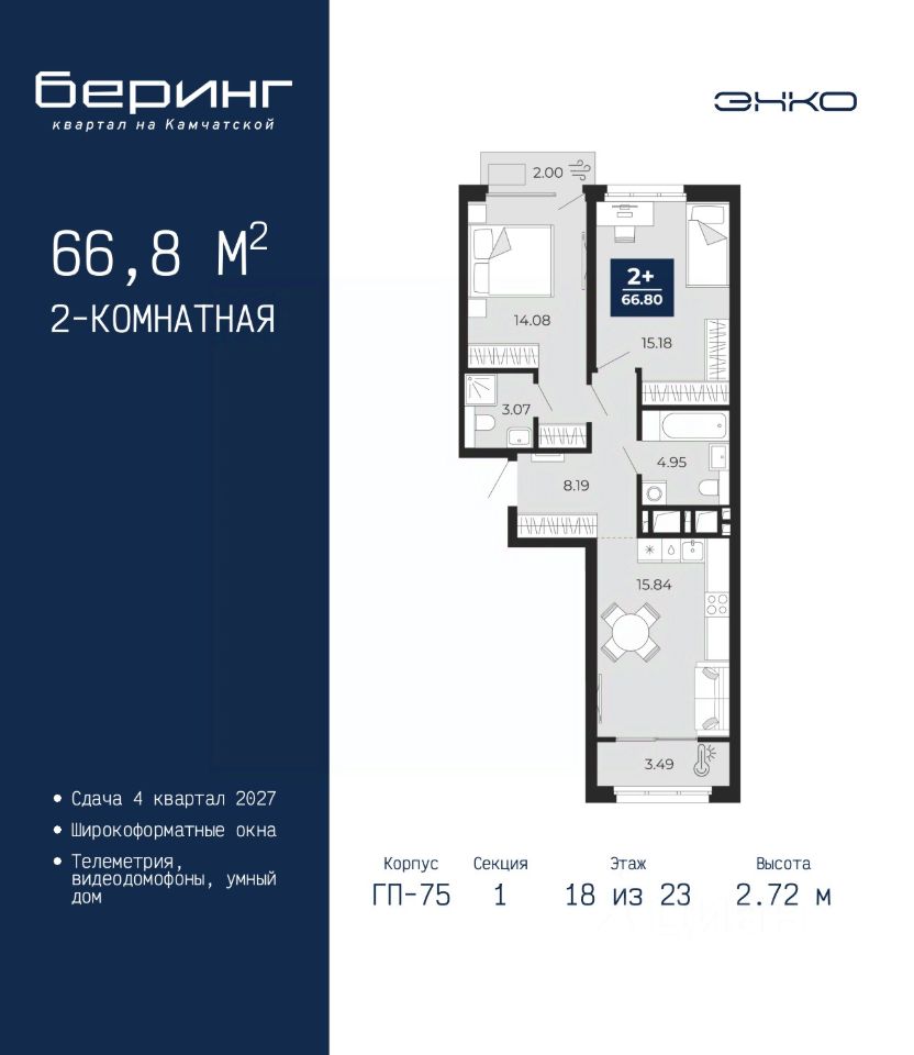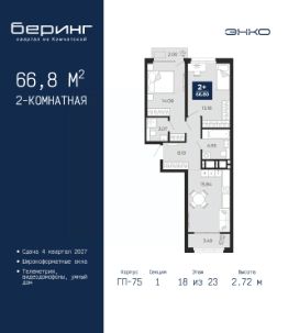 Двухкомнатная квартира в ЖК "Беринг" на 18 этаже. Общая площадь: 66.8 кв.м. Высота потолков 2.72 м.