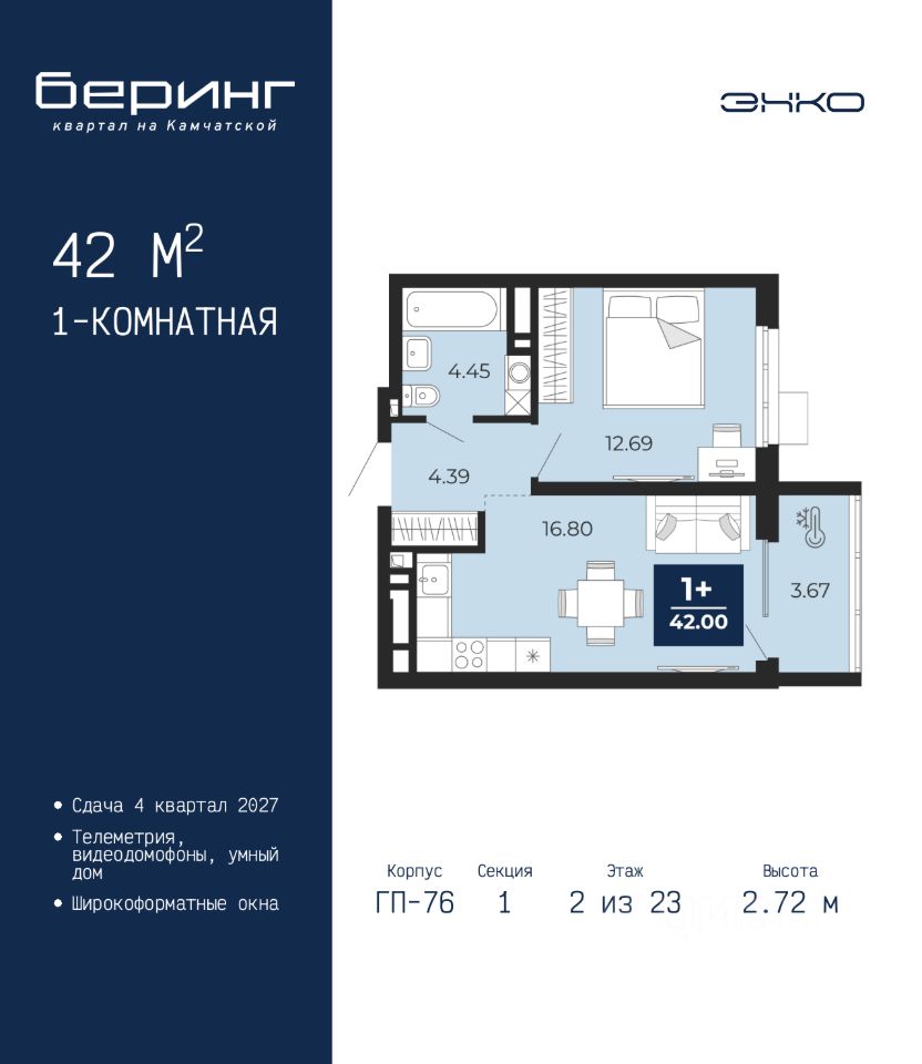 Просторная 1-комн. квартира с предчистовой отделкой в ЖК "Беринг" на 2 этаже. Общая площадь: 42 кв.м. Высота потолков 2.72 м.