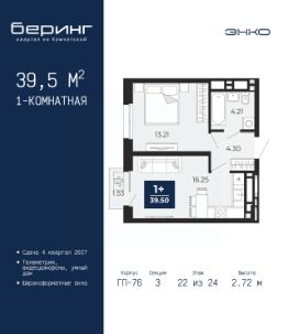 Однокомнатная квартира от застройщика с предчистовой отделкой в ЖК "Беринг" на 22 этаже. Общая площадь: 39.5 кв.м., жилая: 13.21 кв.м., площадь просторной кухни-столовой: 16.25 кв.м. Все окна выходят на одну сторону. В квартире один балкон, один совмещенный санузел. Высота потолков 2.72 м.