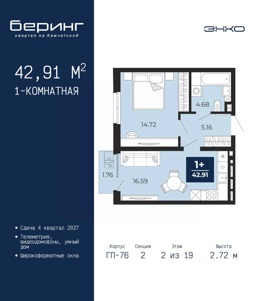Однокомнатная квартира с предчистовой отделкой в ЖК "Беринг" на 2 этаже. Общая площадь: 42.91 кв.м. Высота потолков 2.72 м.