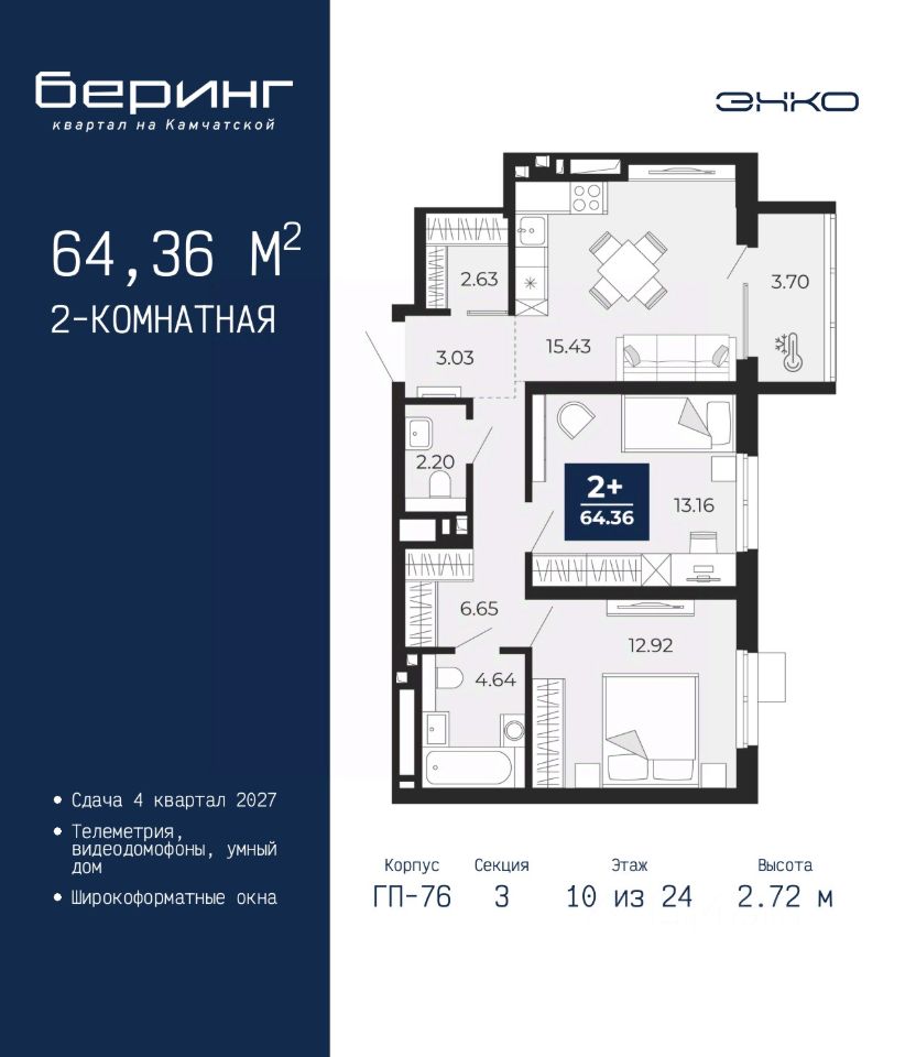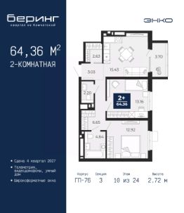 2-комн. квартира в ЖК "Беринг" на 10 этаже. Общая площадь: 64.36 кв.м. Высота потолков 2.72 м.