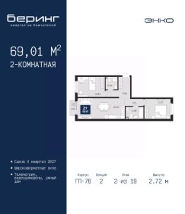 Продается 2-комн. квартира от застройщика в ЖК "Беринг" на 2 этаже. Общая площадь: 69.01 кв.м. Высота потолков 2.72 м.