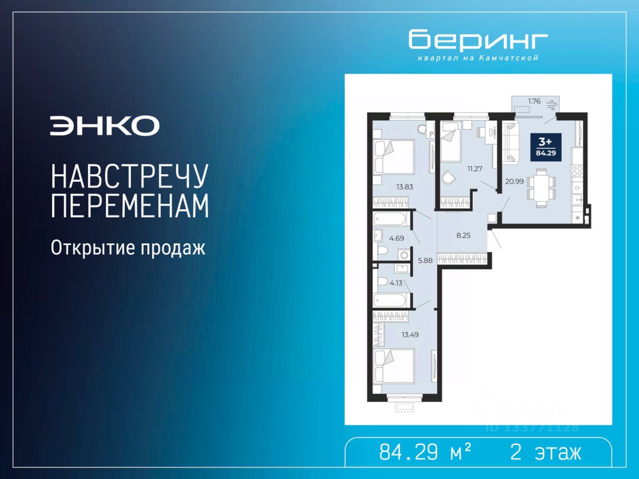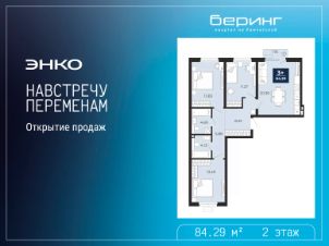Просторная 3-комн. квартира в ЖК "Беринг" на 2 этаже. Общая площадь: 84.29 кв.м. Высота потолков 2.72 м.