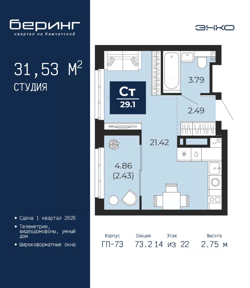 Однокомнатная квартира-студия в ЖК "Беринг" на 14 этаже. Общая площадь: 31.53 кв.м. Высота потолков 2.75 м.