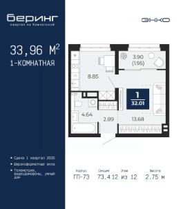Просторная 1-комн. квартира в ЖК "Беринг" на 12 этаже. Общая площадь: 33.96 кв.м. Высота потолков 2.75 м.