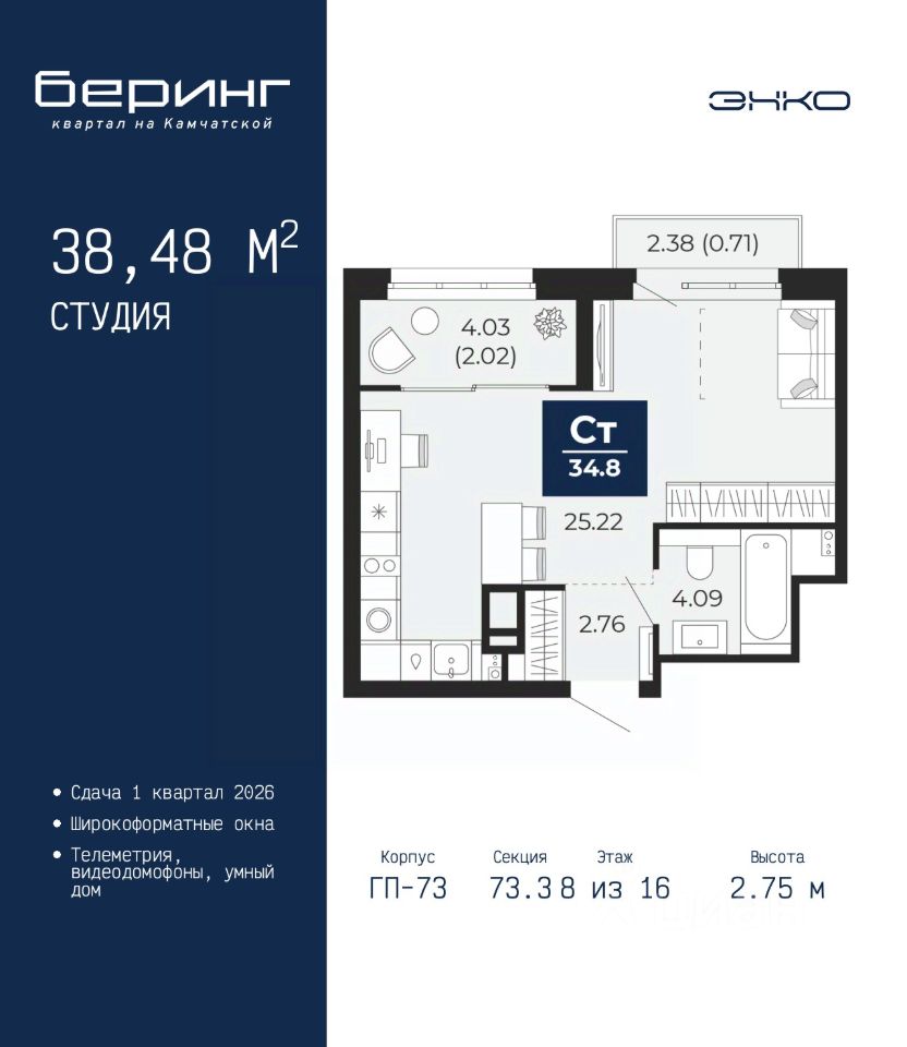Просторная 1-комн. квартира-студия в ЖК "Беринг" на 8 этаже. Общая площадь: 38.48 кв.м. Высота потолков 2.75 м.
